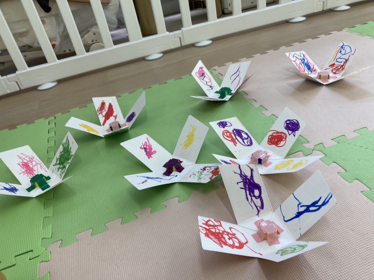 一足先に0歳児チームは牛乳パックのコマ作りをしました(*^^*)誕生日会の後に製作となると集中力がもたないかもしれないので🤣