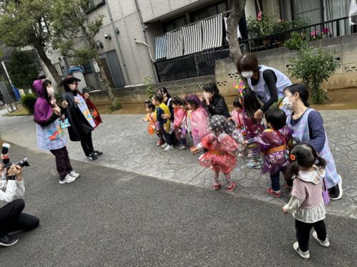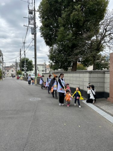 第四公園⇒三角公園⇒神社の小道⇒御嶽神社の4ヶ所で保育士が待ち伏せしていて『トリックオアトリート!』と唱えると『ハッピーハロウィーーン!』とノリノリな先生たち(笑)