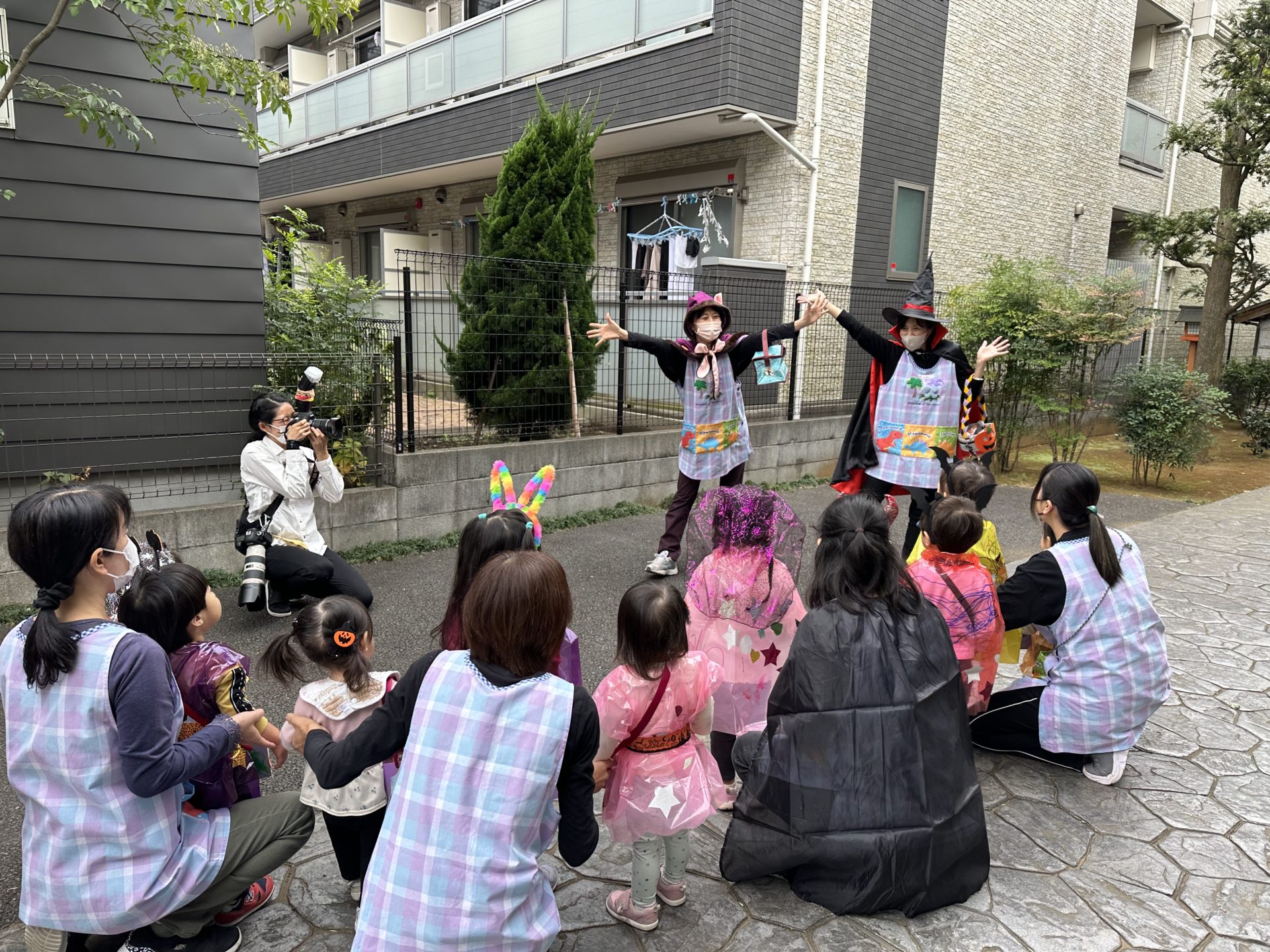 第四公園⇒三角公園⇒神社の小道⇒御嶽神社の4ヶ所で保育士が待ち伏せしていて『トリックオアトリート!』と唱えると『ハッピーハロウィーーン!』とノリノリな先生たち(笑)