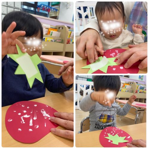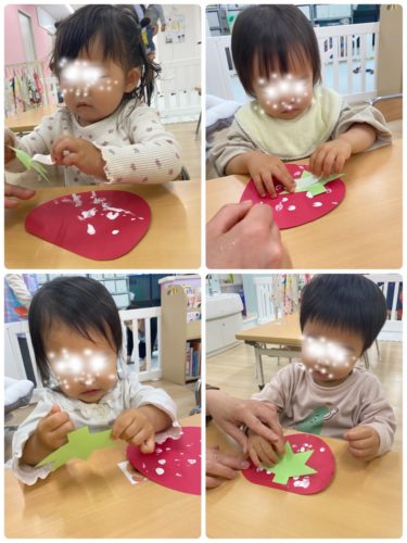 2歳児は糊付け作業です。