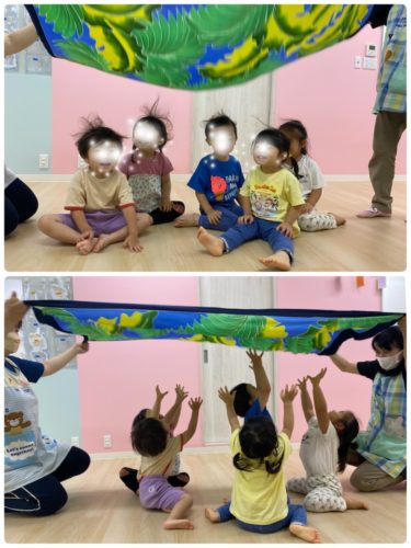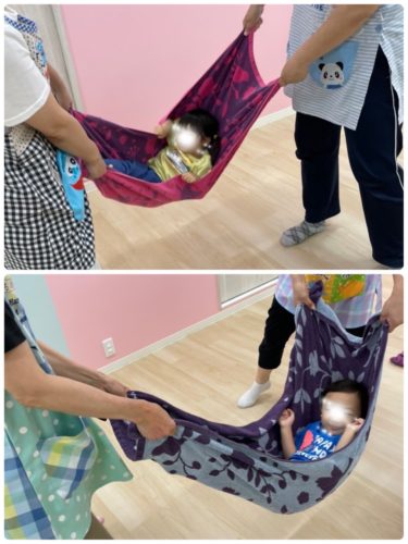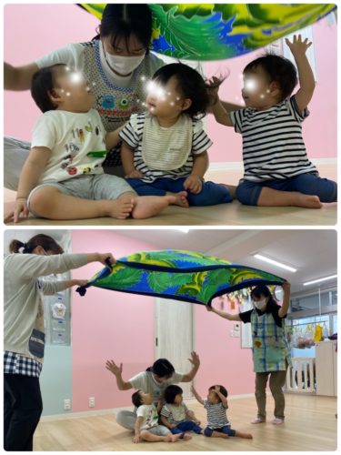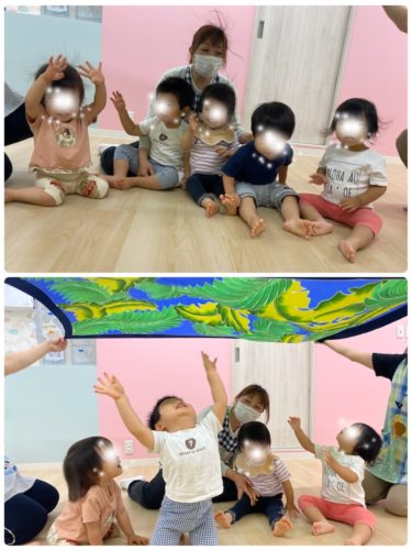バスタオルに座ってもらい保育士が引っ張る電車ごっこをしたかったのですが盛りだくさん過ぎて今日は時間切れでした💦残念!!