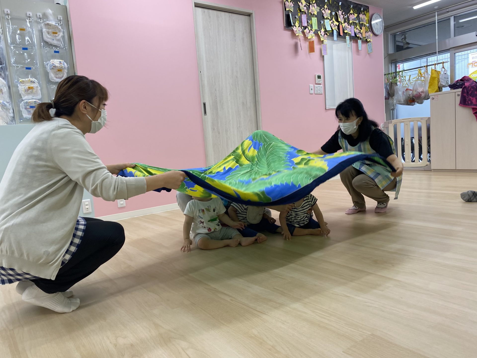 バスタオルに座ってもらい保育士が引っ張る電車ごっこをしたかったのですが盛りだくさん過ぎて今日は時間切れでした💦残念!!