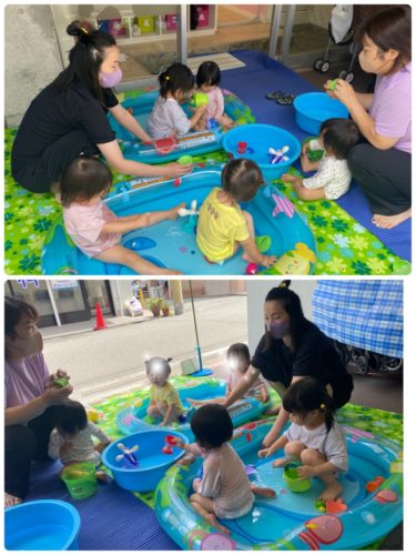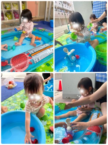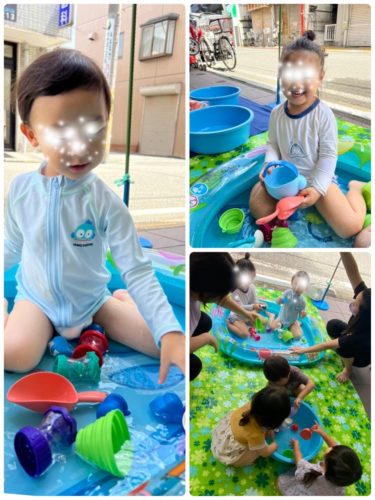 保育Roomことり.2022.7.5.(火) 2022.07.05 やっと今年 初プールです🏊 と言っても、ぬるま湯をうっすら溜めて水遊びをする程度なので「プール」と呼ぶなんておこがましい感じなのですが🤣 目隠しのパーテーションが風で倒れそうだったので今日は取り去ってしまいました。 台風の影響でしょうか? 暑かったので有難い風でしたが 色々が飛んだり倒れたりするのは危険ですね💦
