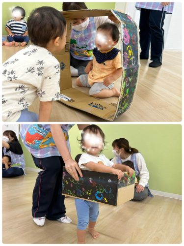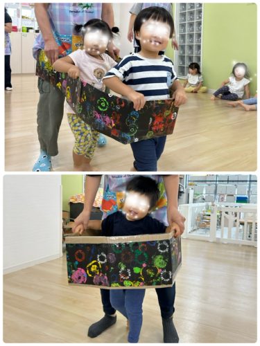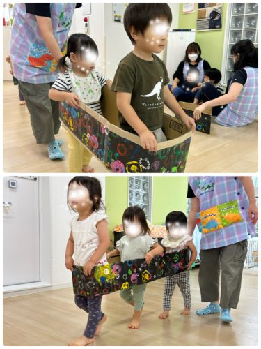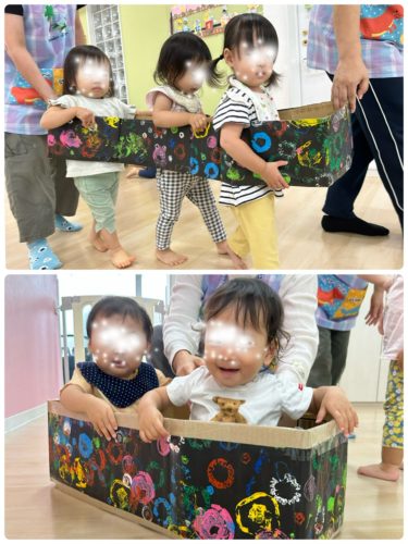 その後のお楽しみは 以前みんなが作成した花火の画用紙をアレンジした電車ごっこ遊び🚃。