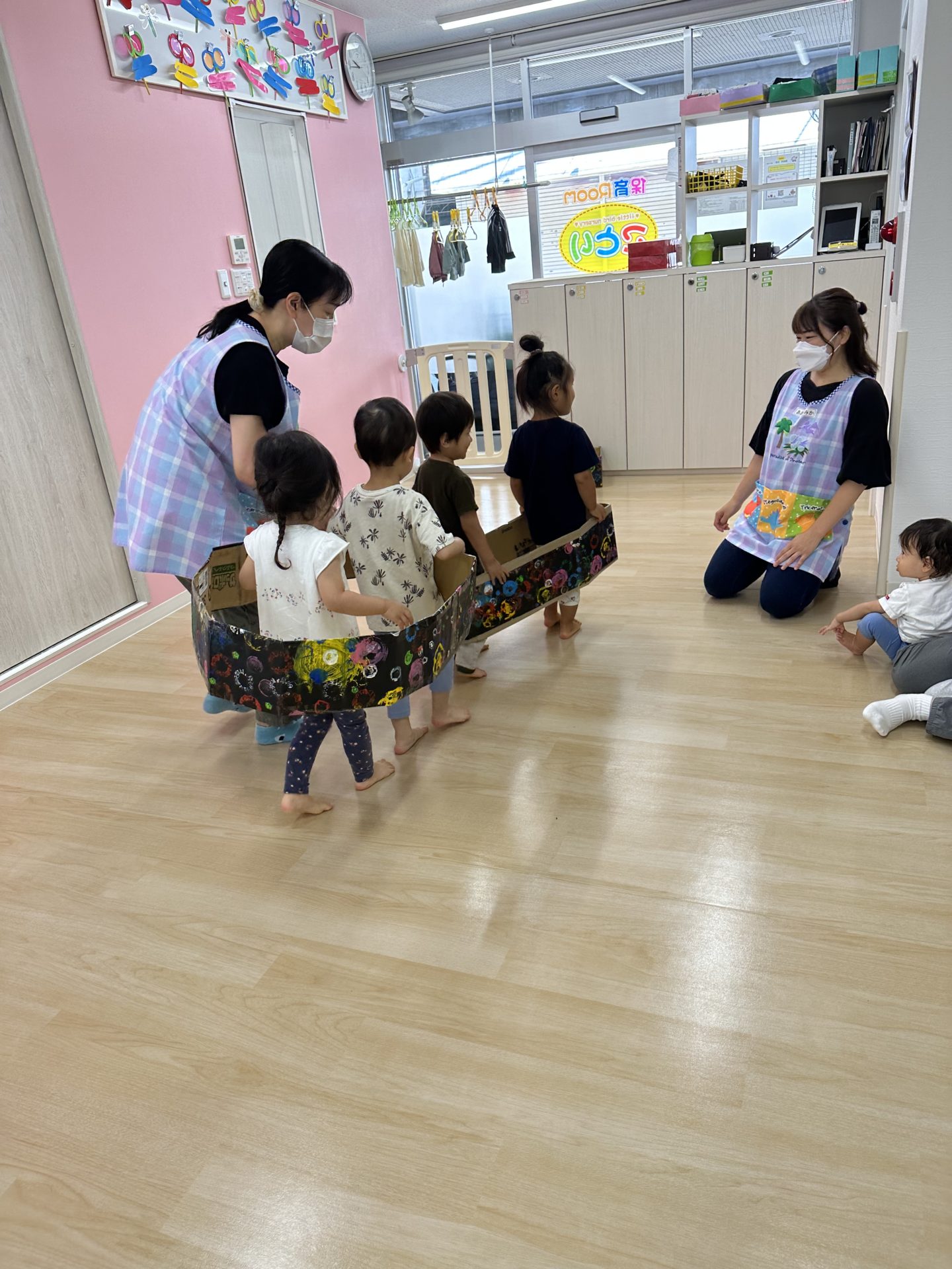 その後のお楽しみは 以前みんなが作成した花火の画用紙をアレンジした電車ごっこ遊び🚃。