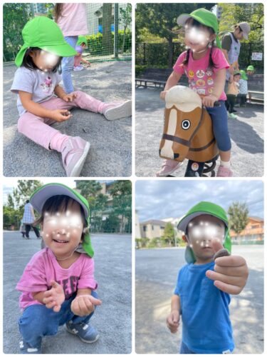 どんぐりが落ちていることを知っている子ども達は一目散にフェンス付近へ向かいます。大きな丸いどんぐりやまだ緑色の若いどんぐりや帽子付きのどんぐりなど、形や色の違いにも気付く子ども達。