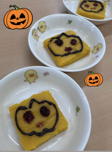 給食の先生たちが、みんなの為に腕を振るってくれました。給食を見た瞬間の子どもたちは『あ~🤣おばけ~👻かわいーーー』と、大喜び。(こわい~と言ってる子もいましたが笑顔だったので本当に怖がっていたわけでは無さそうです。)