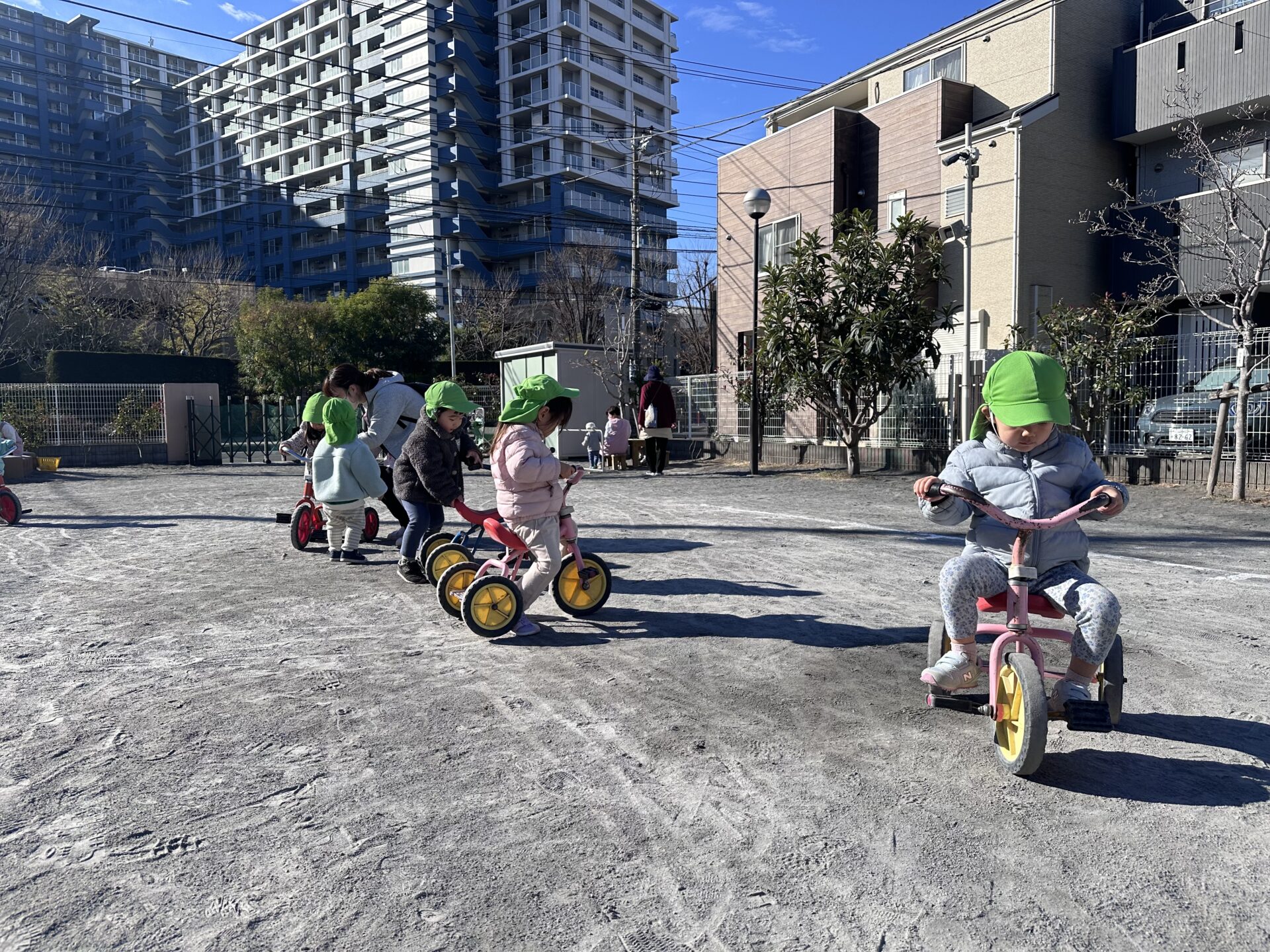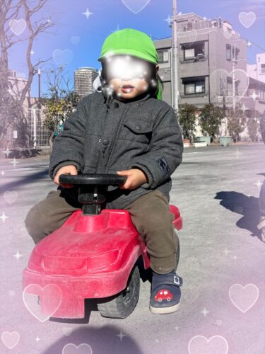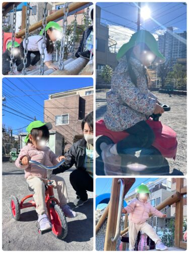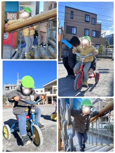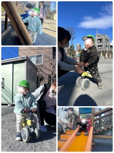 ミニカーや、足蹴りバイクに跨り バランスをとりつつ前に進もうと頑張る子どもたち!