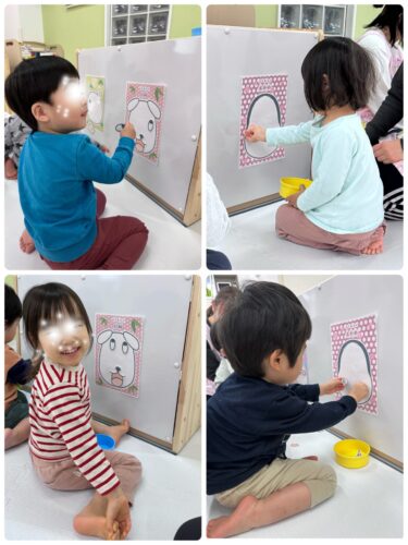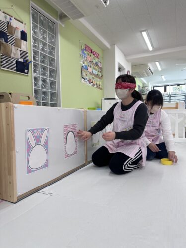 目隠ししてるので、みんなで『もっと上だよー』『反対向き〰️』『そこそこ!』などと、教えてあげたので 何となく それなりの仕上がりに♡子どもたちも大爆笑しながら 楽しみました!