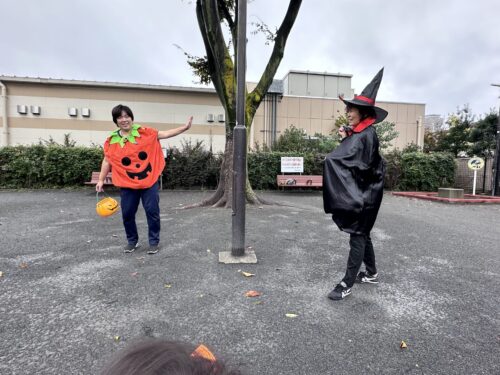 第四公園に着くと、木の影から仮装した保育士が、デデーン❣️と登場(笑)