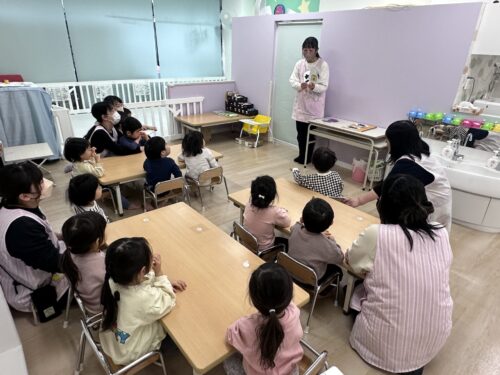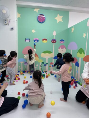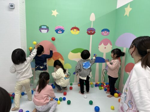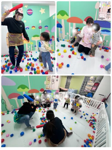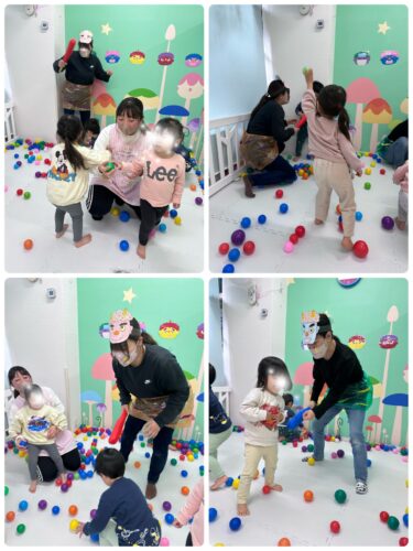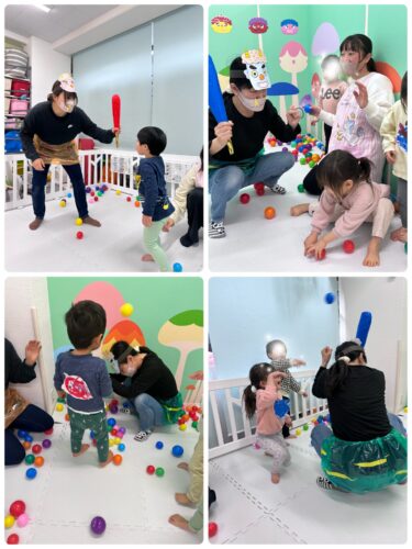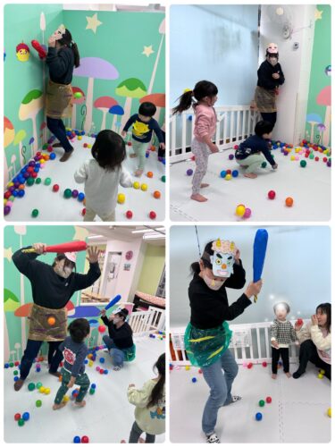 消費者庁で豆の誤嚥や窒息のことから豆やナッツ類は5歳頃までは、食べさせないでくださいとの事もあり、保育園ではカラーボールで鬼退治をしました。