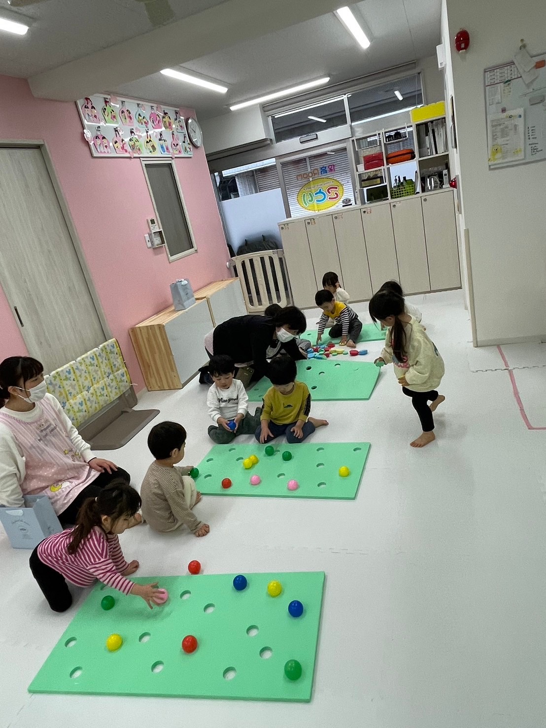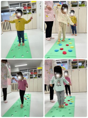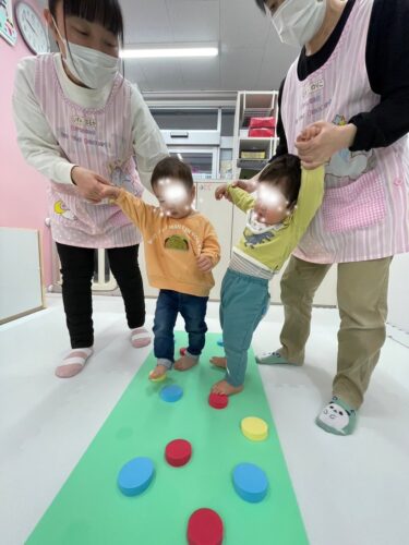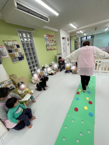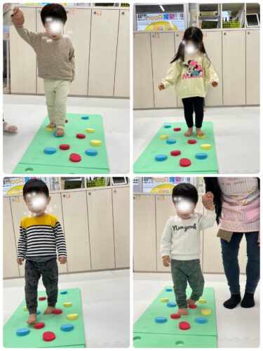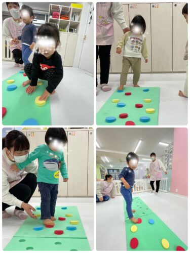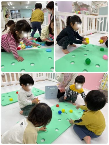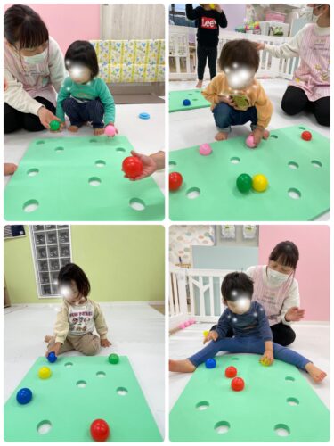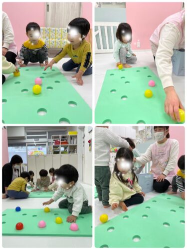 穴を踏まずに よけながら歩いてみたり、色指定で歩いてみたり、色々工夫しながら遊び、後半は穴めがけてカラーボールを転がし入れるゲームに花が咲きました!