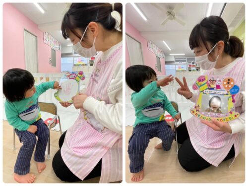 2歳になったよ~✌️の②が、これまた難しいのですが 保育士の指と自分の手を見比べて一生懸命 指先に集中するS君なのでした♡