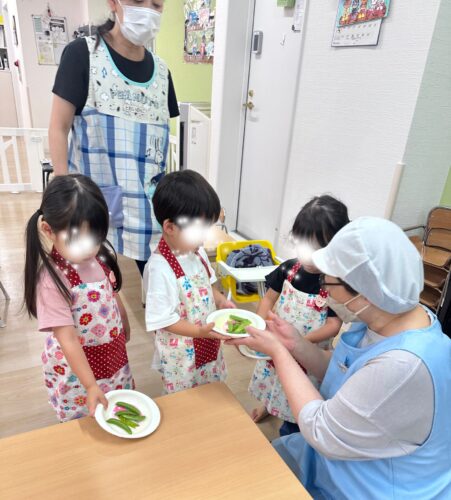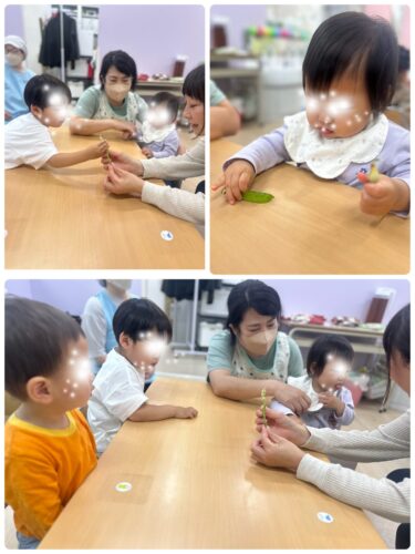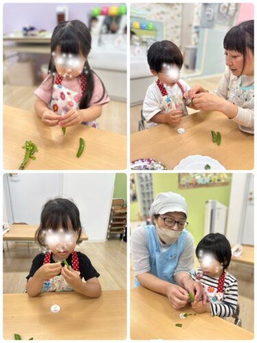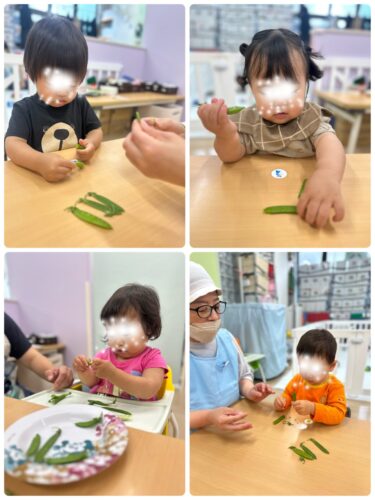 ちぎったり口に入れようとしたり(頑張って阻止しました.笑)触れて遊ぶ用の不揃いの豆で遊ぶことができ ご機嫌でした♪そして出来上がった絹さや&スナップエンドウを『お願いします。おいしく調理してください♡』と渡しました。