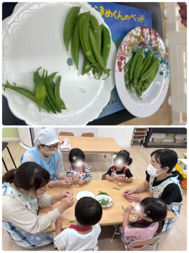 今日は食育DAY。前回、絹さやに少し触れあっていたので そらまめくんのベットの絵本をみるなり『あ~‼この前お豆見たよね~』と関連していることにいち早く気付く2歳児さんでした♪
