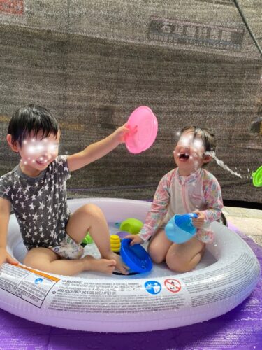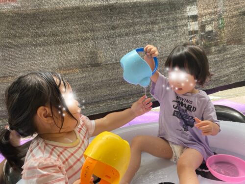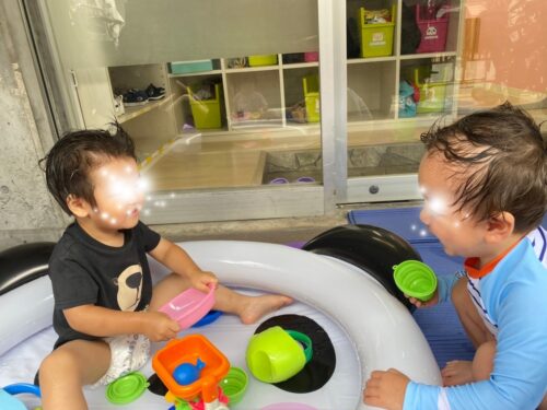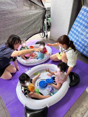 保育園では暑いながらもプール遊びを楽しむ子ども達です♪気温によって水温を多少変えているので結構快適だと思われます☺監視員の保育士は水浴びできないので過酷な時間なのですが頑張っております。