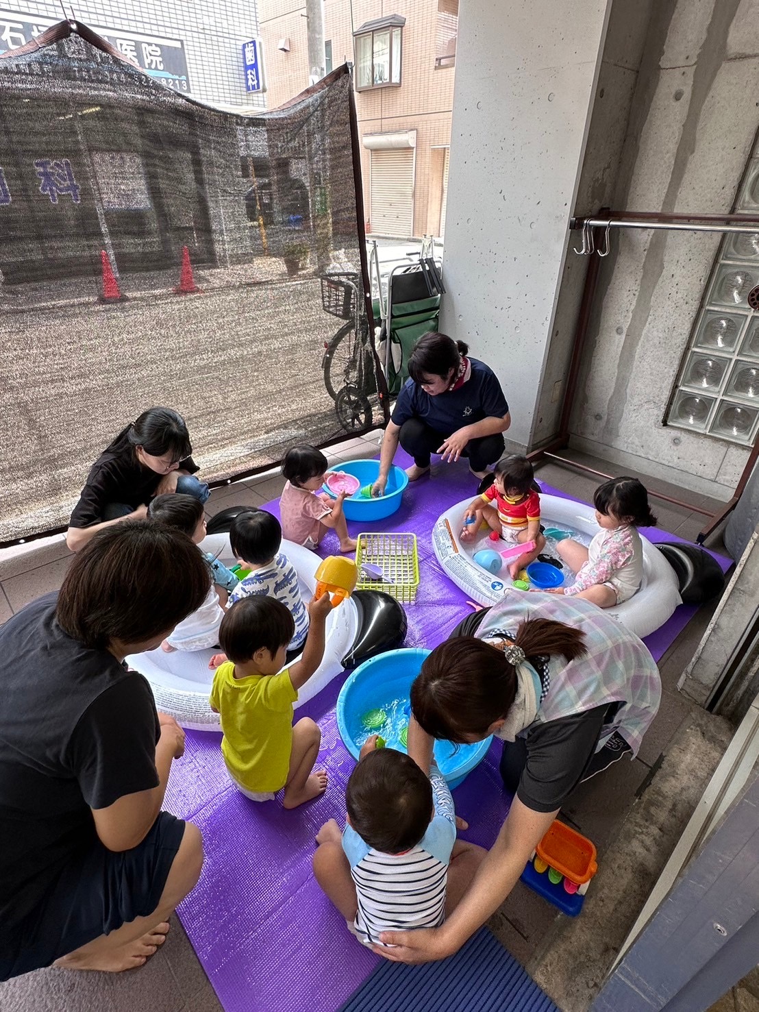 保育園では暑いながらもプール遊びを楽しむ子ども達です♪気温によって水温を多少変えているので結構快適だと思われます☺監視員の保育士は水浴びできないので過酷な時間なのですが頑張っております。