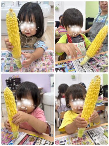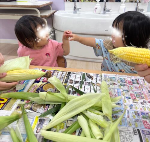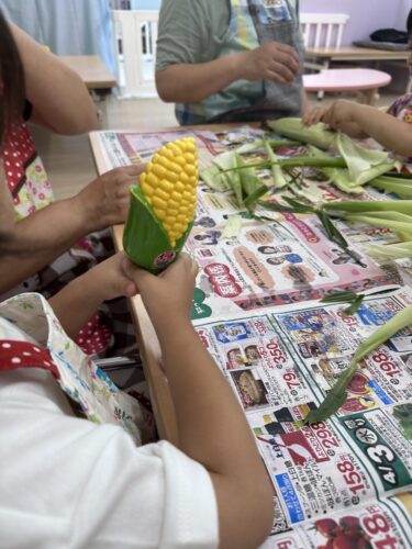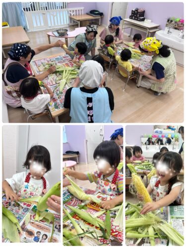 今日は食育でとうもろこしの皮むき体験をしました。生きていくのに必要不可欠な食について興味を持ってもらうのは大切なことですよね♡