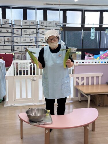 まずは、栄養士の英子先生から皮付きとうもろこしを見せてもらいました。
