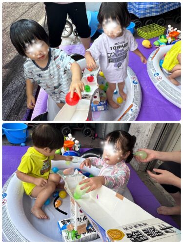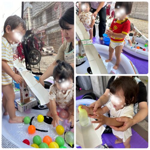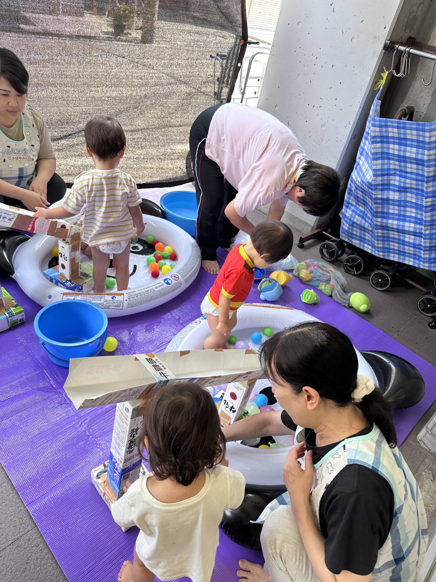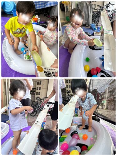 前半は足だけ水に入り、カラーボールや水風船をコロコロ転がして楽しみ、後半は水遊びに移行しました!(^^)!