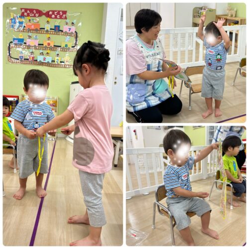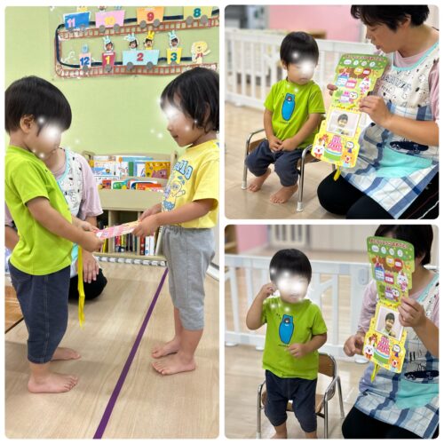 7月生まれは2名で、2人とも7月の誕生日を迎えると2歳です✌️✨️二人とも誕生カードの自分の写真を見て “こうやったんだよ~!!” と、同じポーズをしてみせてくれました(笑)