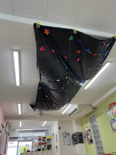 自分たちで貼り付けた星で出来た天の川を見上げながら 七夕の歌を歌って楽しい七夕集会となりました🎵