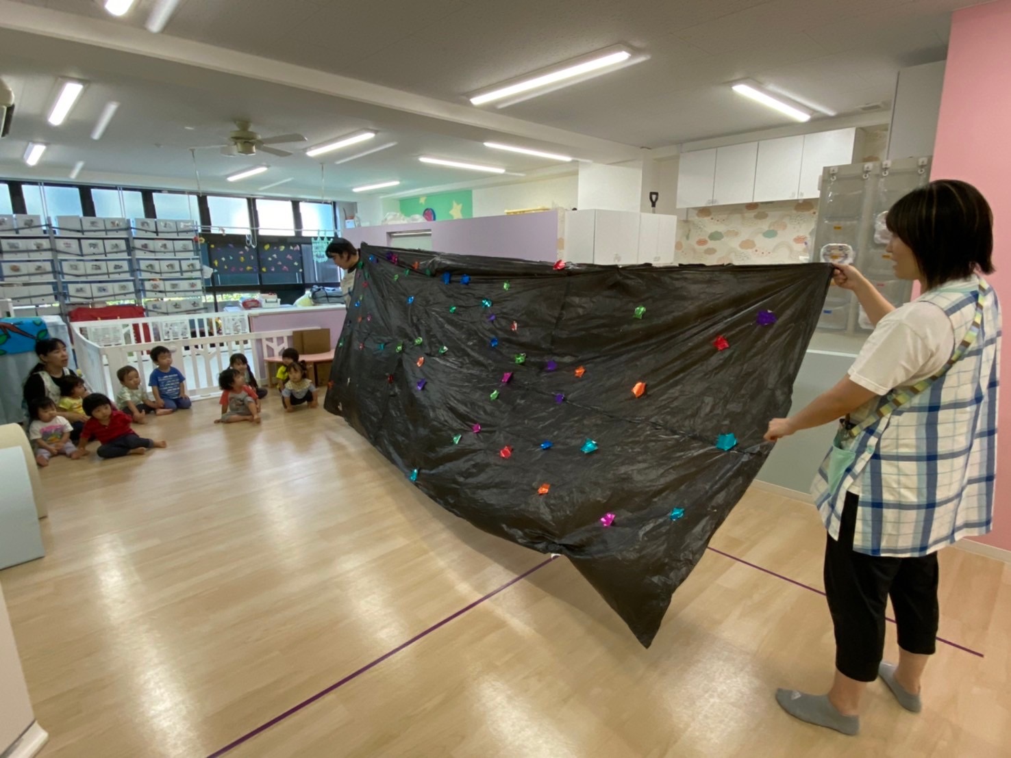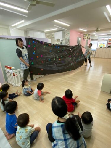 お話を聞いて七夕という行事の簡単な由来を学んだあとは みんなで天の川を作りました😊