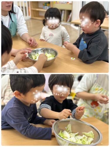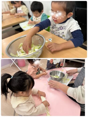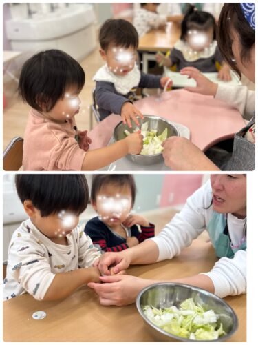 今日は、冬の野菜を知り、断面や ちぎる感覚を通して食材への感心を高める事を目的として 白菜に触れました。