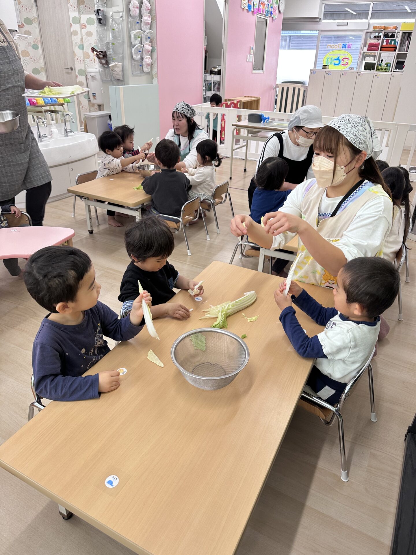 今日は、冬の野菜を知り、断面や ちぎる感覚を通して食材への感心を高める事を目的として 白菜に触れました。