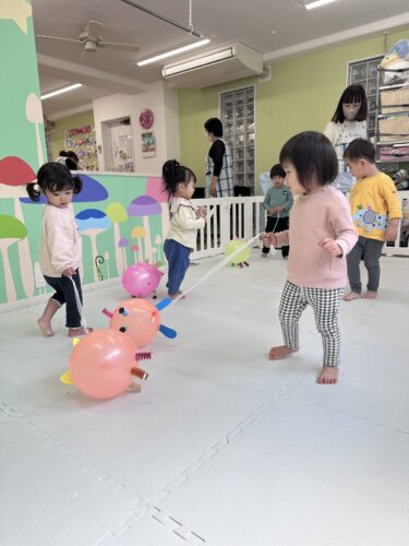 ことり保育園には電池式のワンワン吠える犬のぬいぐるみがあります(通称:こむぎちゃん)。こむぎちゃんに、綱をつけてお散歩遊びする子ども達が楽しそうだったから、との事です。