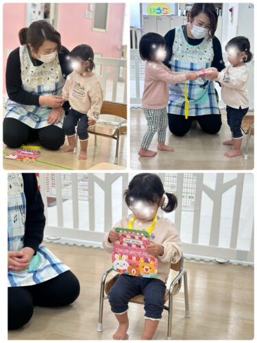 お歌のプレゼントや誕生カードをお友達にもらい、少しずつ緊張がほどけたMちゃん(笑)ちょっと緊張しちゃったね!!と声を掛けると、緊張しちゃったー( ´艸`)とオウム返しではありましたが言っていて思わず笑ってしまいました!