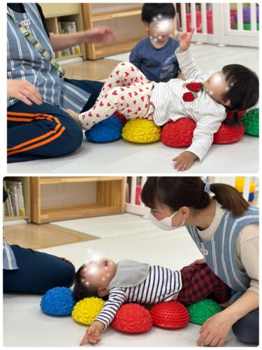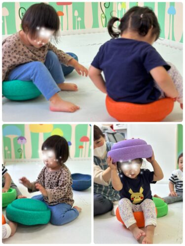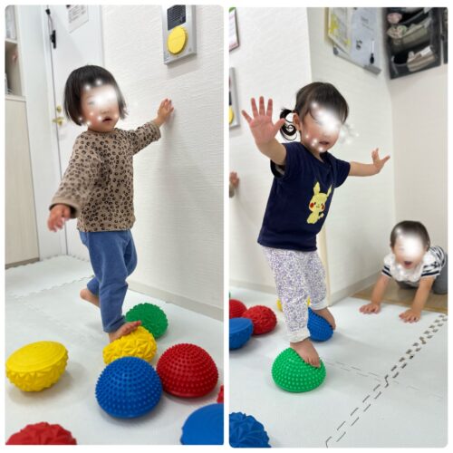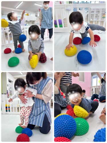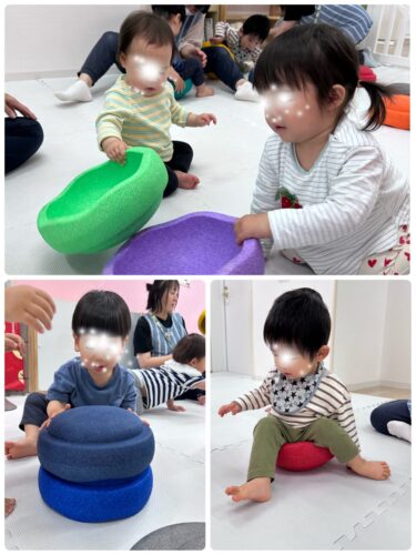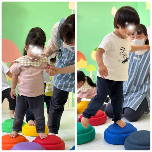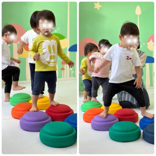 このように平らではない物の上に立つのは簡単なようで意外と難易度が高く、体幹がしっかりしていないと出来ないので苦戦している子もいました(^^♪