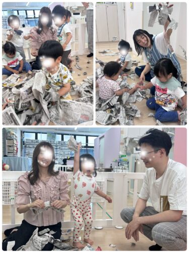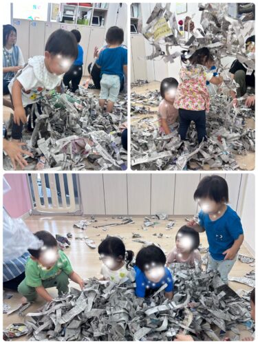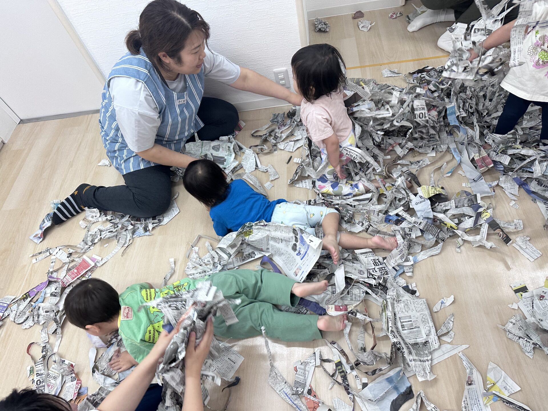 その後は新聞紙遊びをしました。新聞紙をちぎったり、丸めたり、穴をあけて覗いたり、被ってみたり‥