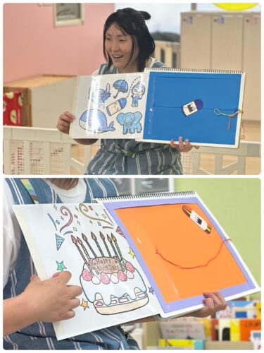 保育士からは『どんないろがすき』のスケッチブックシアターのプレゼントがありました。みんなで一緒に歌い、色ごとに何が隠れていたのかクイズをしつつ “ぜんぶのいろがすき” の所で最後にケーキが出て来て盛り上がりました🎂✨