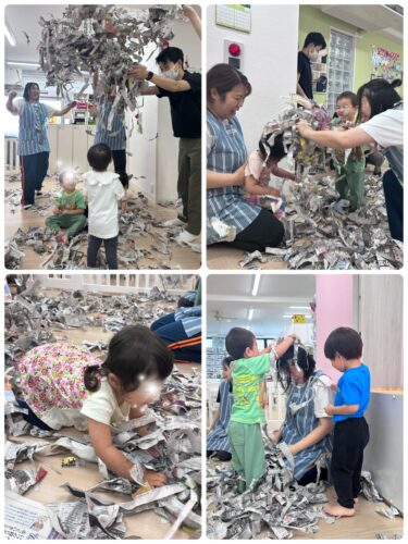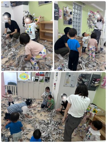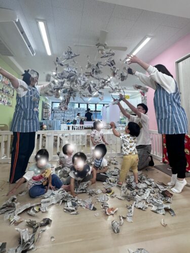 みんなで細かくちぎってちぎって、最後に “5・4・3・2・1” それーーー!と、新聞紙シャワーをしました( * ॑꒳ ॑*)