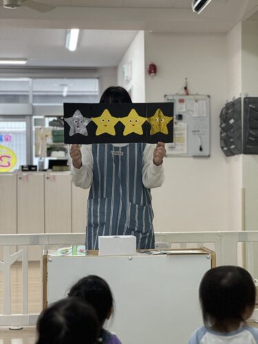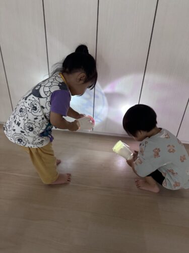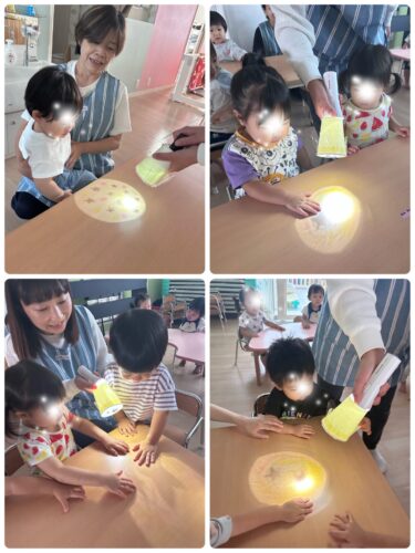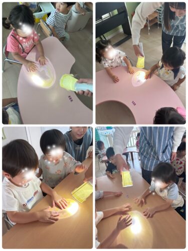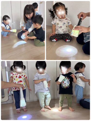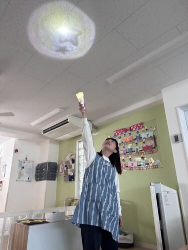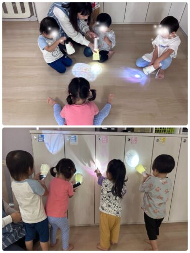 地面に光を当ててみたり、下から自分の顔を照らしホラーになったり(笑)0歳児さんから2歳児までそれぞれみんな違った遊び方をしていました。保育士作のBIGな星★の絵は、かなり映えて子どもたちが大喜びしてくれました(^^♪
