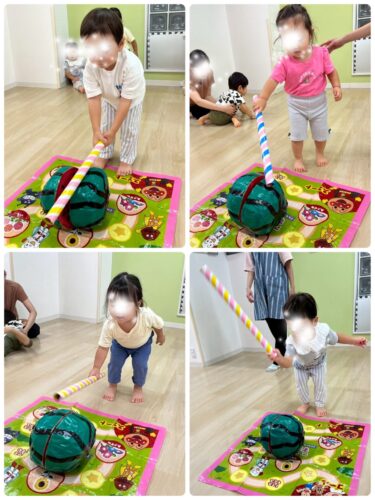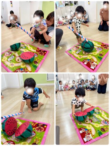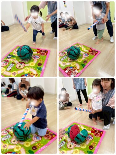 両手で一気にそれ~!!🍉と叩く子、ノコギリみたいにギコギコやる子、片手でヒョイ!! と叩く子、など 様々でしたが 応援する周りの子たちも大盛りあがりでした✨