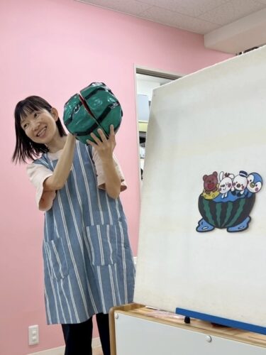先生が手作りした 大きな張りぼてのスイカ が登場すると、子どもたちは「わぁ~!」「おっきい!」と大喜び。