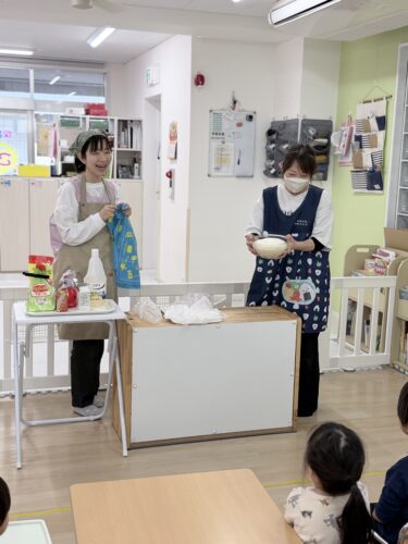 まずは『中華まん』って何??ということで食育担当の保育士がなんと布で肉まんを作ってきてくれました!!なんとクオリティーの高い事 (笑)