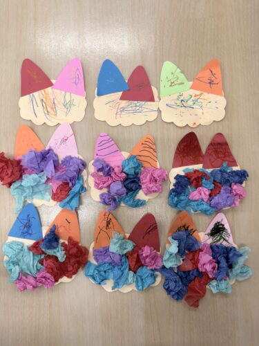 0歳児さんはクレヨンでのびのびとなぐり描きを楽しみ、1・2歳児さんはなぐり描きに加えて、花紙をちぎって丸め、貼り付ける制作に挑戦しました。