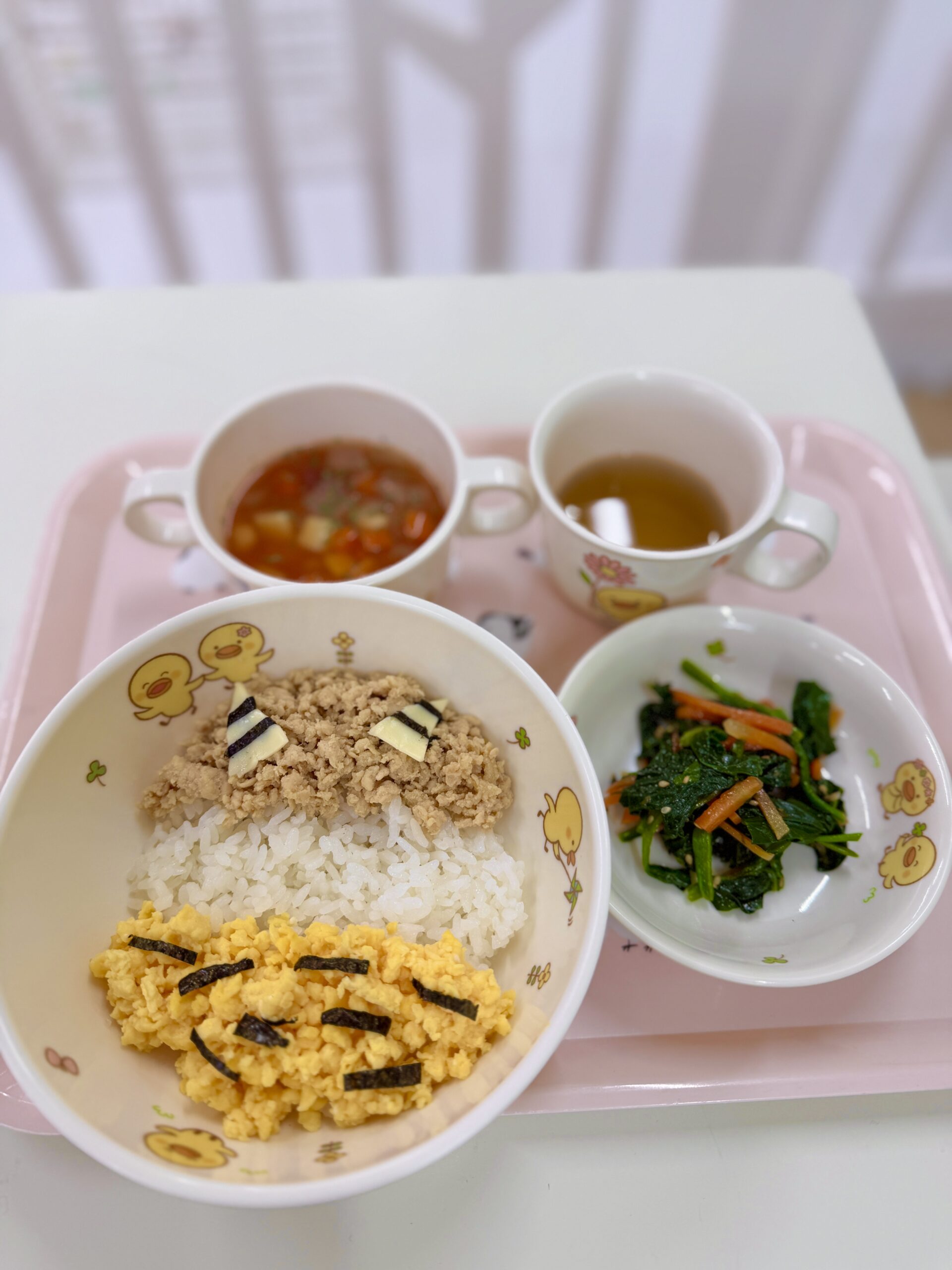 スープに入っている小さくカットされた野菜は何でしょうか?の調理担当の先生からの質問に、じっくり味わう子どもたちで じゃがいもかな?あれ?なんか甘い!などと、具材当てクイズに盛り上がりました。笑