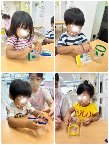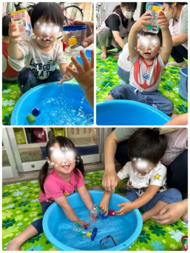 その後は ペットボトルのミニジョウロ作りをして 自分で作ったミニジョウロで水遊びをしました♪