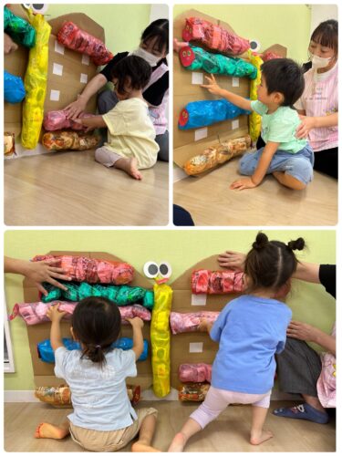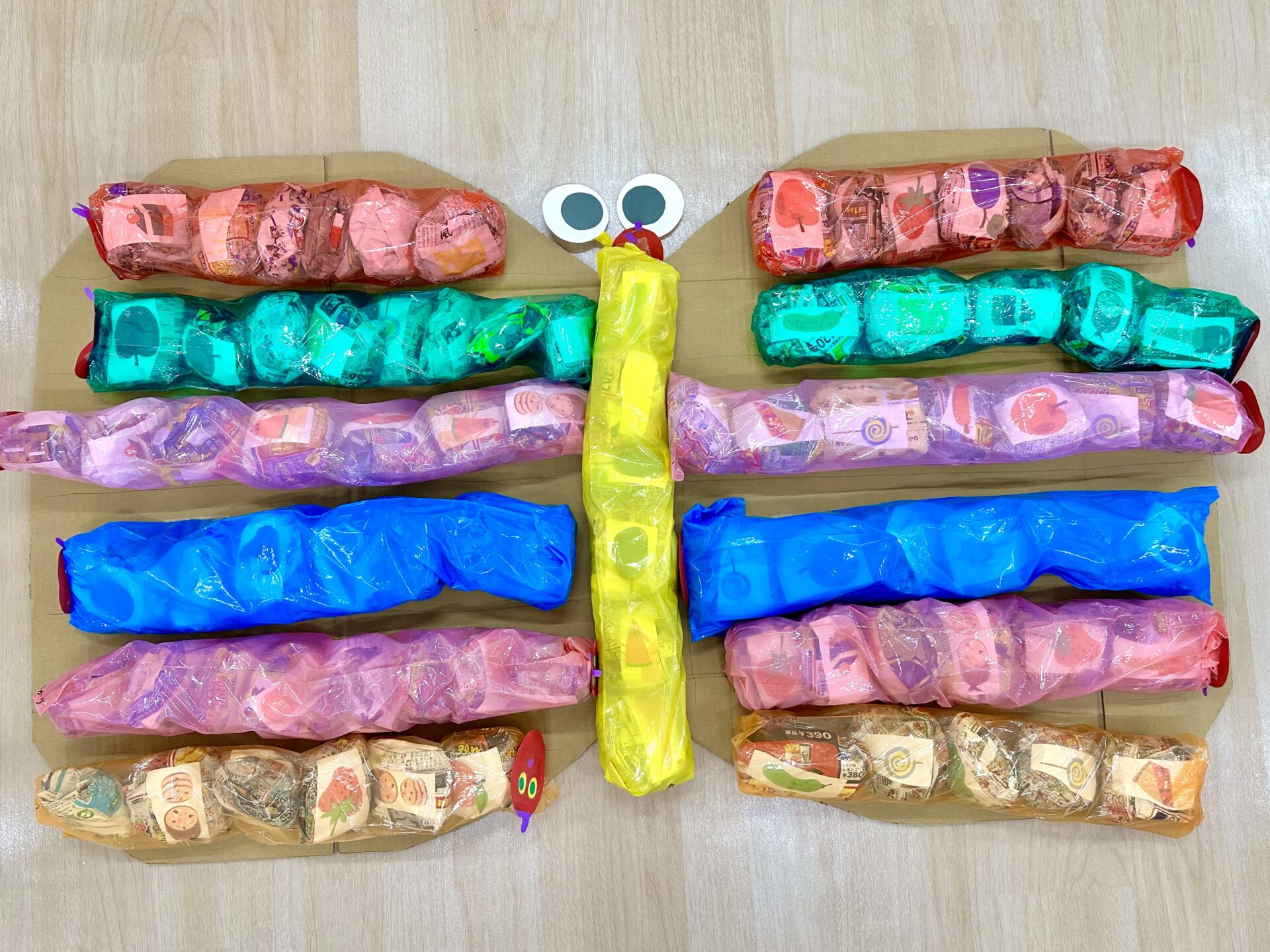 カラフルあおむしに、お菓子やフルーツを食べさせると 長~いオリジナルあおむしになり、そこに顔を貼り付け完成させました✨
