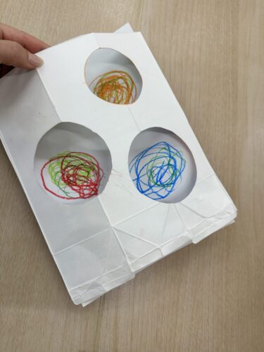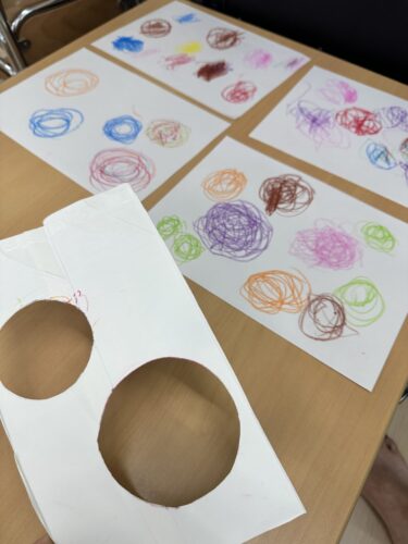 低月齢児は、こんな感じの型抜きを貼り付け好きな色でクルクル描きました𖦹 ‧̮𖦹