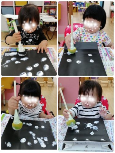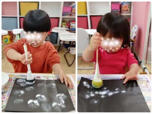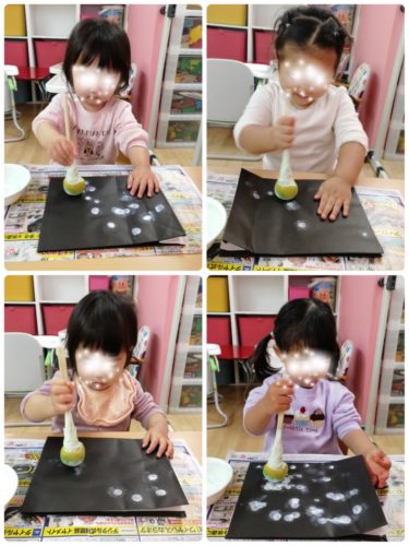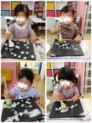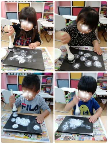 絵の具のタンポで背景に雪を降らせました❄️