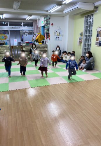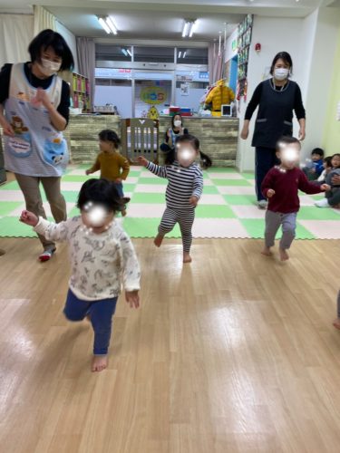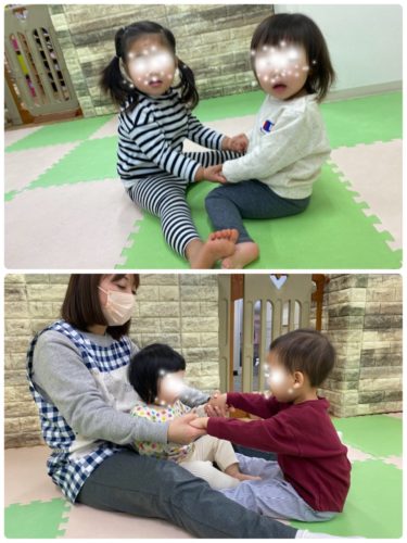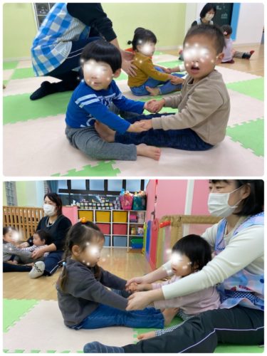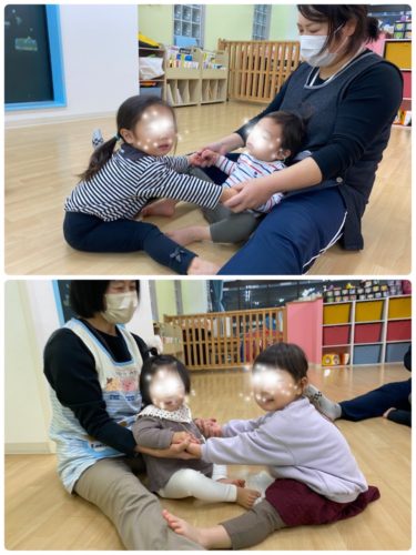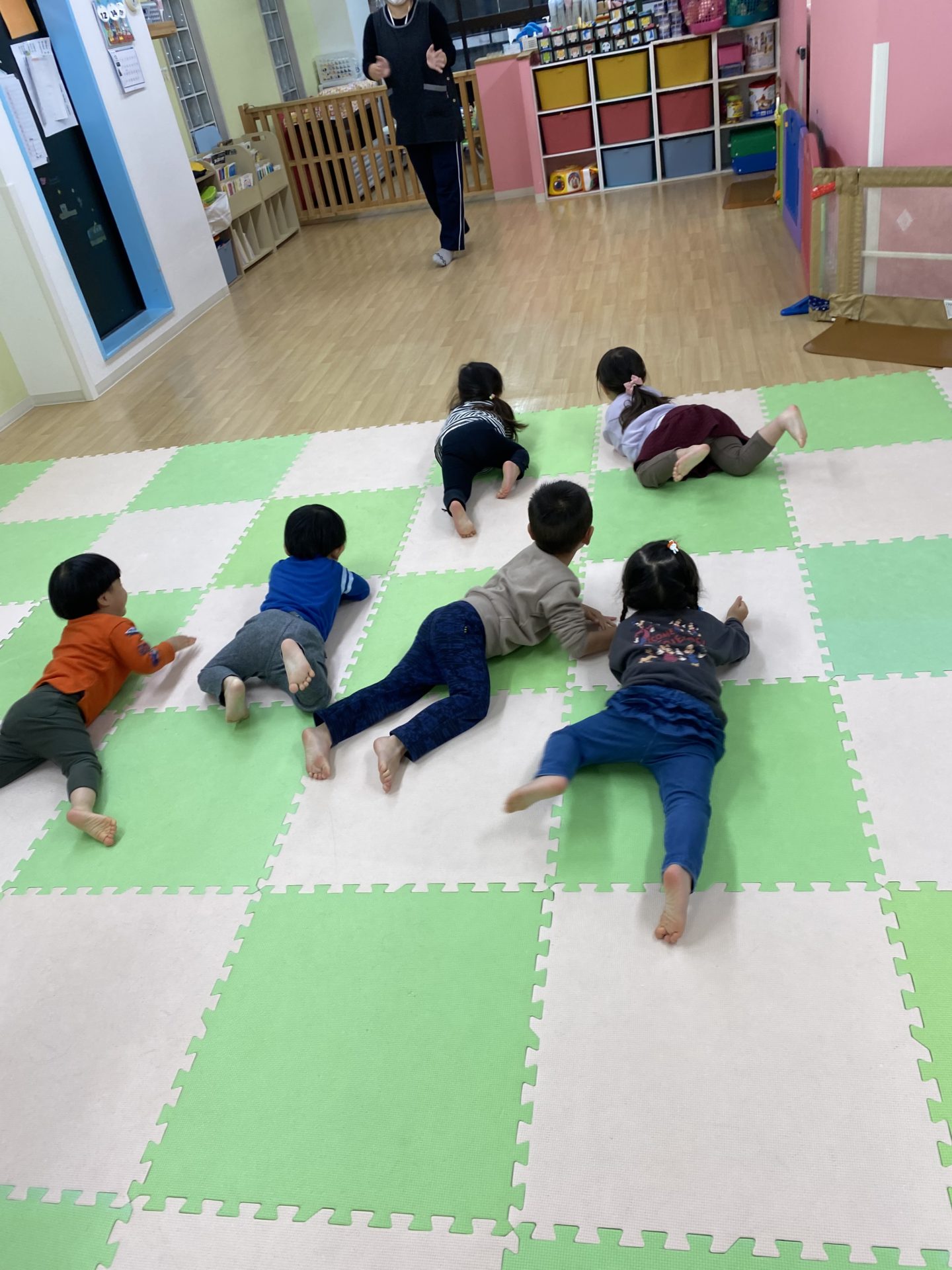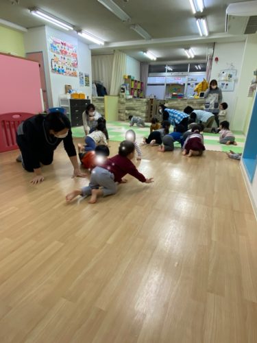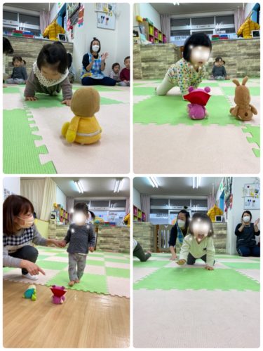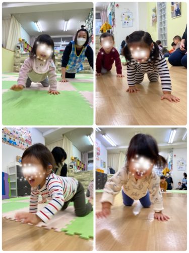 最初は0歳児さんも参加出来る 緩やかなものを。周りのみんなに『頑張れ~』って応援されるとちょっと緊張するのか 普段ならキャッキャッとハイハイ遊びするのに固まってしまったRちゃん(笑)。