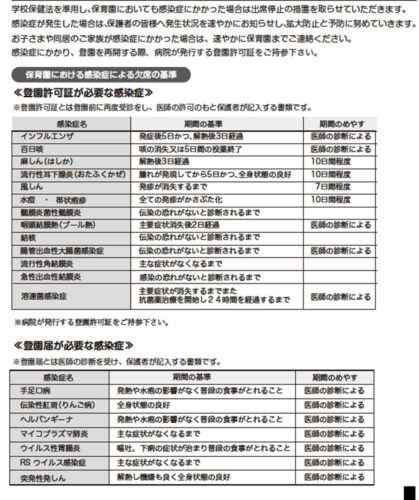 感染症について 2021.05.252023.03.02 感染症および投薬について ※保育園における投薬の取扱いについて ・川崎市の小規模保育事業所等にあたっては、基本投薬はできませんのでご了承ください。 ただし抗けいれん剤やエピペン等で、健康管理委員会において医学上必要やむを得ないと 認められた場合のみ投薬を実施出来るものとします。